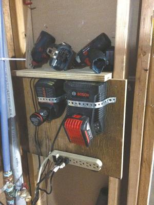 Battery Chargers Attached To Shop Wall FARM SHOP Miscellaneous Jack Middleton Marquette Mich : “I didn’t like having the bench space in my shop cluttered with battery chargers for my cordless tools so I used plumber’s strapping to attach the chargers to the shop wall I place the cordless tool on a shelf while its battery is being charged and plug the charger into a power strip that I installed below the shelf I can easily shut the power off to the charger whenever it’s not in use ”