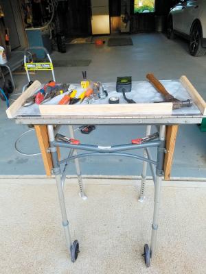 Rolling Walker Turned Into Portable Workbench FARM SHOP Miscellaneous John Stuber DeSoto Mo : “I turned a rolling walker into a handy portable workbench It’s sturdy lightweight easy to maneuver and quickly folds up for storage I used a piece of scrap aluminum to make the 16 by 24-in top and screwed wooden pieces onto 3 sides to contain the tools A piano hinge off an old aluminum cabinet is screwed onto the back side which allows the walker to fold “A pair of short 1 by 6 boards connect the piano hinge to the walker’s tubular frame The boards attach to the piano hinge with hex head screws and to the walker with carriage bolts A metal strip is screwed onto the piano hinge for extra strength “To fold the workbench I raise the top and then push down on factory buttons at the walker’s front corners which releases the legs so I can fold them in