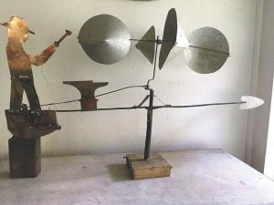 Geiger made his first weathervane when he was 14 out of scrap metal he found around the farm to simulate a carpenter bent at the hip sawing wood, using eccentrics on a shaft to create the motion. Besides aluminum and copper scraps he used thick galvanized wire (used for fire service telephone wire) to create the shaft and hold four aluminum cups that catch the wind and rotate like an official weathervane. Mounted on a piece of copper tube, the vane fits on the copper tubing of a lightning rod. After more than seven decades, it still works atop Geiger’s barn.