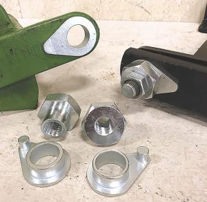 Those parts include a hardened flange bushing with a small built-in “dowel” that fits into a hole drilled into one side of the arm, and a threaded hex bushing that fits into the flange bushing. The operator drills a small hole into the arm for the dowel, and reams out the existing worn hole in the arm a little larger for a more precise fit for the bushings. A special shoulder bolt holds the 2 bushings together.