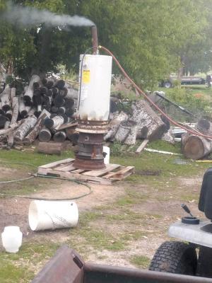 It keeps enough hot water coming to do 50 birds each session, which used to take 1 1/2 20-lb. LP tanks of fuel. The wood-fueled heater saves quite a bit of money, as he butchers 200 chickens over 4 days.