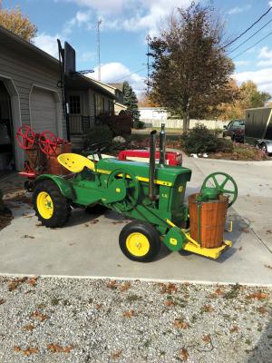 “The Deere hit and miss engine came with two flywheels. I had to lengthen the tractor’s frame by 10 in. and narrow it up by 1 1/2 in. so that both flywheels would extend outside the frame,” says Riffey. “I also attached a homemade metal belt shield to the platform and added a chrome straight pipe exhaust.”