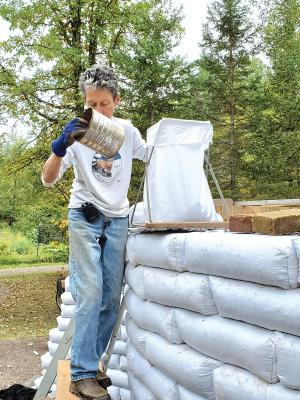 With the help of family and friends, Rovig created a raised tamped gravel pad and then built up walls using bags filled with dirt. She notes that earthbag construction is used by some people to build homes (www.earthbagbuilding.com). Sandbags are filled with damp soil that contains 5 to 30 percent clay and then stacked like bricks. Two rows of 4-pronged barbed wire placed between the layers help stop the bags from slipping apart. The bags are firmly tamped down so when they dry they are rock-hard and fit tightly together, similar to adobe.