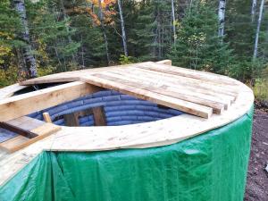 The earthbag structure encloses a 10-ft. dia. room with 6-ft. walls topped by a wooden roof insulated over the top with styrofoam and dirt. During January’s sub-zero temperatures, the cellar stays between 35 and 38 degrees and 90 to 96 percent moisture - perfect for the potatoes, apples, beets, Brussels sprouts, carrots and other produce from her large garden.