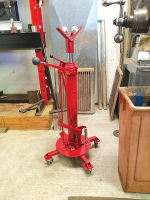 The hydraulic jack came equipped with a 22-in. long, 1 1/8-in. dia. cylinder and an internal pump. It came off a wrecked trailer. The top end of the cylinder was damaged so Hartmann cut it off. He made a metal sleeve to slip over the top of the jack’s 22-in. long, 1 1/8-in. dia. cylinder, and welded a V-shaped bracket onto the sleeve that slips over the cylinder. He then bolted a pair of multi directional, load-bearing transfer balls onto both sides of the bracket. The bottom of the cylinder clamps onto a 4-wheeled base made from a 10-in. dia., 1/4-in. thick steel plate.