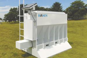 Solar-Powered Automatic Cattle Feeder LIVESTOCK Feeding Equipment A new cattle feeder tells cattle when to eat by emitting an audio signal doing so multiple times throughout the day Dave Barney president of Service Line was looking for a better way to feed his own cattle and the Automatic Solar-Powered Cattle Feeder was the result “We built the first unit to handle smaller herds of up to 10 full-size animals ” says Steve Meyer of Service Line “The demand was there so we added a larger unit for herds of up to 20 head The feeder can handle greater numbers if feeding calves or smaller size animals ” The smaller feeder is 6 ft wide 9 ft long and 8 ft tall The larger one is circular in design with an 8-ft diameter and an 8-ft height Both feeders have hopper capacities of 3 000 lbs Ask for Barney to discuss price The Hanen feeders are fabricated from heavy-duty steel and are 100 percent powder-coated for durability Individual calf guards can be installed Optional vision blockers are also available ensuring separate feeding stations for each animal An attached battery is recharged by a solar panel making the programmable feeder fully portable It’s designed to be picked up and moved by a tractor with forks Once in place it can be programmed to deliver desired amounts of feed up to 6 times per day “I’m dedicated to providing controlled nutrition that results in high-quality animals ” says Barney The company points to studies that show a balanced diet evenly distributed throughout the day creates a calmer animal on less feed without sacrificing growth Contact: FARM SHOW Followup Service Line Inc 2320 Zinga Dr Reedsburg Wis 53959 ph 608 524-0204 or 800 774-7900; www automaticcattlefeeder com