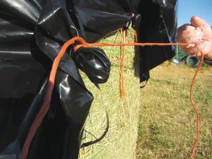 To keep wind from getting in under the plastic, we tie it down in many places. With big round bales we like to make long rows of bales - usually 2 bales high - with enough space between the rows so we can tarp each row by itself without the rows touching each other. Putting a big tarp over multiple rows creates valleys between the rows which collect water and snow that creates big ice chunks when it freezes. That makes it difficult to remove the tarp when uncovering the bales for feeding.