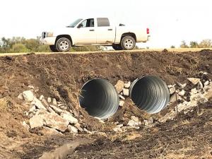 Nolte raised the grade of the approaches to the bridge with nearby pasture dirt and gravel, packing more clay over the pipes and then two layers of coarse and regular road gravel.