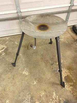 “I spent a few hours grinding off the coating and used a sanding disk to clean it up and get it smooth,” said Nathan. “A broken pop-up tent supplied the legs, which can be adjusted from 21 in. to 38 in. The burner setup was from a grill a friend had laying in his garage.”