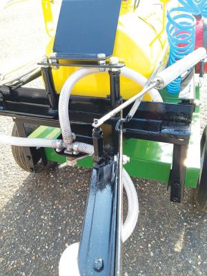 The sprayer is powered by air pressure, which is supplied by a portable tank onto which Bunniss attached a 125 lb. relief valve. This holds enough air to spray two tanks of liquid. Everything on the sprayer is designed for variable spraying rates. The pressure, tips that you use, and the speed you are spraying, are all factors when determining how much weed spray you want to use per acre.