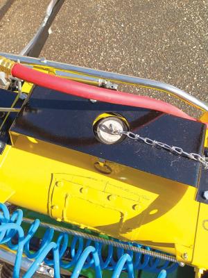 The fill port on the top of the tank is also Bunniss’ invention. He designed it with safety in mind so the liquid tank can’t be pressurized unless the filler plug is locked in, and the iron lock is over the top of the plug. After spraying is done, the tank, hose, tips, and sprayer are flushed with clean water. Next, the drain ball valve under the tank is opened so the water drains out. Bunniss always tries to leave it in the sun to dry out at this point.