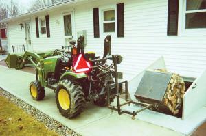 Getting firewood from the woodshed to cellar storage can be messy if you don’t have a transfer system like Paul Zawalick. He loads a box behind his compact tractor, drives to the exterior cellar door, and slides the box down the stairs. Once unloaded to a storage rack in the basement, he winches the box back up the stairs and drives away.