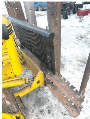 Brush Rake Moves Big Branch Piles AUGERS Norman Bennett says his 1951 Oliver OC-3 dozer has been a workhorse for many years but moving downed tree branches with the blade is sometimes difficult He solved the problem by building a sturdy metal brush rake that mounts to his dozer when the blade is removed “I picked up some old 3/4-in thick metal cutting edges for free that the highway department discarded ” Bennett says “then I cut two of them for horizontal pieces and five of them for uprights ” He spaced the 7-ft long notched bars horizontally about 12 in apart and held them in place by welding the vertical uprights into notches on both bars The horizontal bars mount to brackets on the front of his OC-3 that hold the dozer blade Two 1-in draw pins hold the rake securely in place He mounted a pickup tailgate protector on the backside of the three center uprights to keep brush away from the grill and radiator The black poly protector fits snugly against 1-in bars welded to the three uprights To prevent brush from sliding over the top of the rake he welded 10-in long pieces of rebar to the top of each vertical bar The bottom of those bars extends about 8 in below the horizontal bar of his rake to grab brush that’s piled tight to the ground Each vertical bar has a point at its base to lift branches as he raises the rake Bennett says the rake just like his 72-year-old OC-3 is as dependable as the day is long “The rake picks up and piles branches much better than the blade Better yet in 5 min I can switch back to the dozer blade if I need it ” Contact: FARM SHOW Followup Norman Bennett bigtrukr@icloud com