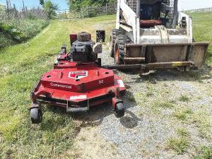 The skid-steer can raise the mower to head height for below-deck blade replacements or service.
