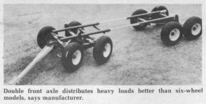 "It pulls easier than four or six wheel wagons and balances out heavy loads for less wear and tear on the box," says Wilbert Sas, Rochester, Minn., designer-engineer of a new eight wheel 4 plus 4 wagon with twin front axles. Both front axles steer together, yet oscillate independently.