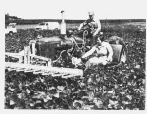 To solve the problem and make his last pass through bean fields as effective as possible, Kroese built a frame of salvaged angle iron and mounted a pair of comfortable car seats on either side of the tractor just behind his wick-type weeder. Mrs. Kroeze and a daughter, Nancy, use plastic squeeze bottles to squirt a few drops of Roundup on those few plants left below as they ride by. "We like the drops from the squeeze bottles better than a spray gun because there's less chance for drift," says Kroeze. The set-up cost $15, plus shop time.