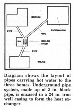 The central boiler which Wood shares with his next-door neighbors Marvin Sorum and Elmer Richnalski cost each of them about $2,000, including a shed for the furnace and boiler, and underground piping to the three homes. Each of the owner's homes had to be converted to hot water radiators at an additional cost of about $1,000 each.