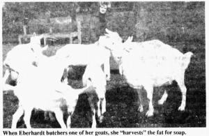 Goat raiser makes soap from goat fat AG WORLD Ag World 14-1-20 "When I butcher a goat for table use, I save the fat for soap-making," says Jo Eberhardt, who raises a herd of Saanen goats near Elkhorn, Wis. "Goat fat contains lanolin, an ingredient that is much sought after for making soap. It brings a high price on the commercial market."