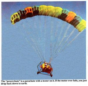 If owning your own airplane appeals to you but you don't have a pilot's license and you're leary about getting into an ultralight, you'll like these new "Powerchutes" that are essentially a parachute with a motor on it. If the motor ever fails, you just slowly float back down to earth.