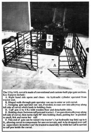 His new-style catcher-hauler is a 12 by 14 ft. portable corral that mounts on the rear 3 pt. hitch of a 90 to 100 hp tractor. The top link of the 3 pt. is adjustable hydraulically, allowing the rear of the corral to be lifted up to 6 ft. above ground level. "If you're dealing with a gentle, mild mannered cow, you can hand carry her calf into a 2 by 4 ft. calf pen build inside the corral. If you don't trust the cow and her temperment, you can drop the corral over the calf, keeping its mother locked out while you enter the corral to hand carry the calf to the built-in calf pen. Then, from the tractor seat, you activate a hydraulic cylinder that opens the corral, letting the anxious mother in to find her calf. She ends up alongside her calf, restrained in a holding chute. Both it and the calf pen have solid wooden floors.