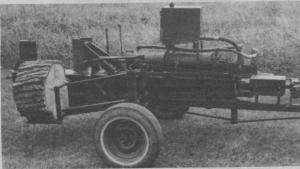He built the splitter using a rebuilt 7 by 24 in. dump truck cylinder, and a 38 gpm pump driven through a Rambler transmission powered off a tractor pto. The ram is mounted on a 10 in. H beam mounted on an axle for towing. MacLean says he likes the pto drive because of the power it provides.