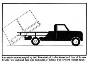 A rolling bale cradle mounts on the pickup bed. Three rollers support the carriage which is made from 3 by 5 by 1/4-in. angle iron and 2 by 2-in. steel tubing. The carriage is free to move 30 in. forward or back. Bales are loaded with a front-end loader or 3-pt. bale spear onto the cradle. To unload, you drive backward and then hit the brakes. The cradle rolls back and tips over the back edge of the pickup. You then pull the pickup forward to clear the bales. Once the bales are unloaded, you slide the cradle forward by hand back into the bed of the truck.