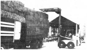 Spielman, a commercial hay grower, removed the Bobcat's loader arms and replaced them with the 2-ton Allis Chalmers forklift mast which he bought from a local construction equipment company. He uses the forklift and a Farmhand bale fork, which is equipped with grab forks, to lift bales from wagons and stack them in sheds or on semi-trailers.