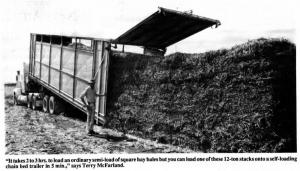 Feeding the hay out is not a problem, he says. Some buyers just plunk big bales down in the pasture and let animals feed off them from all sides. Others put a fence around the bales and let stock feed from on end with a self-feed gate. Others use loader forks to break chunks off the bale to carry t livestock.