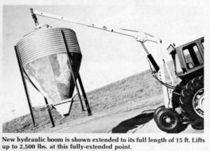 Manufactured by De Geest Manufacturing Co., Sioux Falls, S. Dak., the Mity Hy Boom adapts to 6,500 lbs. class tractors and larger. It's rated lifting capacities are based on 1,300 psi. Telescoping boom extends to 9,12 or 15 ft.