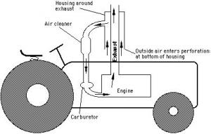 The idea involved making a heat chamber around the muffler pipe. Outside air enters the chamber through perforations at the bottom, runs up along side the heated exhaust pipe, and then out through a piece of pipe down to the air cleaner and into the carburetor.