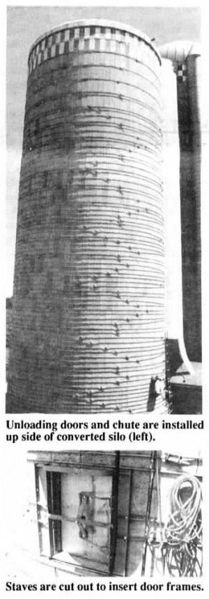 As they do when converting Harvestores, a Hanson crew installs unloading doors and a chute up the side of the silo. They use a regular Hanson silo setup with 45-in. spacing between doors, simply cutting out staves to insert door frames. The trickiest part of the job is loosening the hoops and then repositioning them around the new doors so that the silo doesn't lose any of its support.