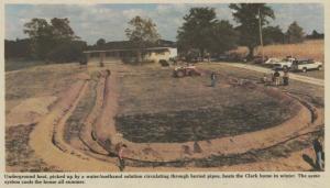Also buried into portions of the loop are a number of thermocouple sensors. Twenty temperature readings and six moisture readings will be taken at given intervals along various points in the trench. This information will be relayed to a data logger in the basement of the Clark home. A direct telephone line from researchers monitoring the experimental system to the data logger's answering modem allows the data to be retrieved at any desired time. If, by chance, there is ever a malfunction in the closed loop system, the monitoring equipment will be able to detect it.