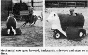 Called "Mac" - which stands for Mechanical Animated Cows - it's powered by batteries and drives like a tractor. It moves faster in all directions than a real cow and is tailormade for training horses to work cattle. Top speed is 30 mph. It goes forward, backwards, sideways and stops on a dime.