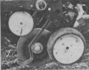 Each covering blade set consists of a spring loaded blade on each side of the double disc opener. While planting, the curved blade slides along on the ground next to the disc blade and holds the ground down so that, as the disc blade turns, it can't pick the soil up and throw it out, thereby opening up a. deep seed furrow. There is just enough tension on the covering blade to hold the soil in place and allow the trash to slide by.