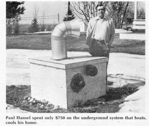 The accompanying drawing shows how Hansel's system is built. Air comes in through a rotating air scoop, mounted on an above-ground housing. When the wind isn't blowing sufficiently, a fan inside the housing does the work. The air then travels through the 125 ft. of underground pipe and on into the house. A furnace filter in the housing screens out birds and bugs.