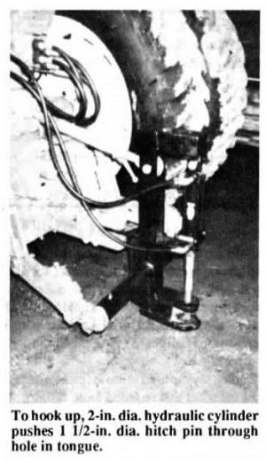 The "Hydra Hitch" mounts on the tractor 3-pt. hitch arms and is fitted with a 2-in. dia. hydraulic cylinder that operates a 1 1/2-in. dia. hitch pin. To hook up to an implement, you lower the 3-pt. hitch to ground level and back up to the implement tongue. Then you use the cylinder to push the hitch pin through the hole in the tongue to hook up.