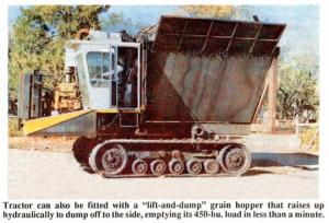 The new tractor's cab mounts on the front left side with a 360 hp diesel engine mounted beside it. A "lift-and-dump" grain hopper mounts on the frame behind. It raises hydraulically and dumps its 450-bu. load in under a minute. When grain hopper is re-moved tractor can be fitted with a bolt-on fifth wheel hitch, 3-pt. hitch, and drawbar.