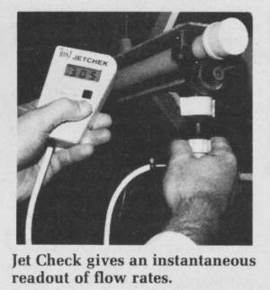 "You just hold the flowmeter up against each nozzle and press the button on the meter to get an instant flow reading in gal. per min. Because of possible exposure to the operator, the flowmeter should be used only with water," Jacoby cautions.