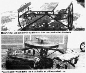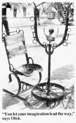 "Memories are made of this," says Olen, who has built a booming business turning old cultivator wheels, plow seats and harness parts into love seats, tables, lamp stands and other furniture that customers buy to decorate living rooms, dens, patios and back yards. It's attractive, functional and great for conversation.