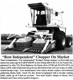 That revolutionary "row independent" Kemper forage chopper we first told you about two years ago in FARM SHOW is now being sold in the U.S. by Taylor Implement Co., Box 725, West Highway 24, Hoxie, Kan. 67740 (ph 913 675-3272). It takes a 10 ft. wide swath and can go in any direction to harvest row crops, or solid-seeded forage crops. Low maintenance twin rotary drums replace conventional gathering chains, belts. Each 5 ft. dia. drum is equipped with a circular cutting knife, made up of 8 bolt-on sections. New-style header adapts to Deere, New Holland and Claas self-propelled choppers.