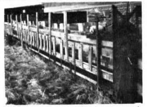 Converted 40-ft Long Bale Elevator Makes a Nifty Powered Feeder LIVESTOCK Feeding Equipment 15-2-34 This converted 40-ft. long bale elevator makes a nifty powered feeder to feed 1,200 head of sheep. I don't have to walk or drive through the sheep with bales of hay. I just back the feeder up to the hay mow and drop hay right onto the feeder. When we need to clean, it pulls out of the way. It's powered by a 1/2-hp. electric motor that drives a Chevrolet auto transmission with three speeds forward and one reverse. I can stop and start the feeder with a remote switch up in the hay mow. The feeder rides on the chassis from an old IH corn binder. I built feed openings on the sides of the elevator. The entire feeder can be raised with a crank as manure piles up around it. (Alfred N. Nelson, W5935 Hwy B, Rio, Wis. 53960 ph 414 992-5305)