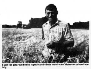 Butch will accept a lift down from his tractor if someone happens to be there when he needs it. But he's quite capable of getting himself both up and down from the tractor cab without help. Through constant use and necessity his arm has become exceptionally strong. On the ground, Butch walks on the stubs of legs that are shorter than his shirt-tail. But walk he does, slowly and with a rocking motion, and he always gets where he wants to go.