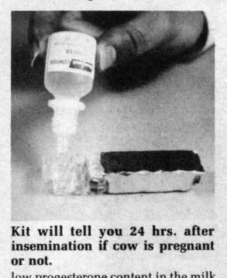 If it turns dark pink that means a low progesterone content in the milk which means the cow is in heat. A light color indicates a high content which means she is not. Kazor says that even when used with animals in which estrus is difficult to detect, farmers have been able to achieve 100% success in artificial insemination. The kit is used again 24 days after insemination. It will tell you whether or not the animal is pregnant. If not, you can inseminate again without missing an entire cycle.