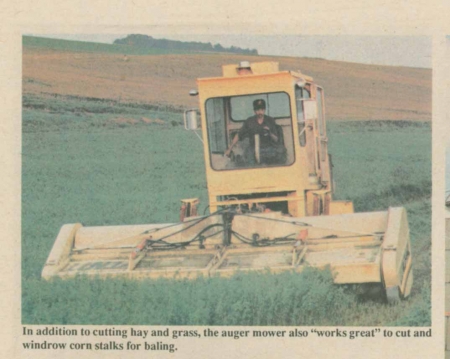The belt-driven 12-in. dia. cutter auger eliminates all conventional sickle sections, guards, and drives. It cuts hay with a "rip cut" that Lundahl says conditions the crop, and then feeds it to the center and out the back in a side-by-side double windrow. Dirt doesn't bother the hardened steel pivoting teeth so you can cut right through gopher mounds with no problems. The teeth bend back when they hit a rock.