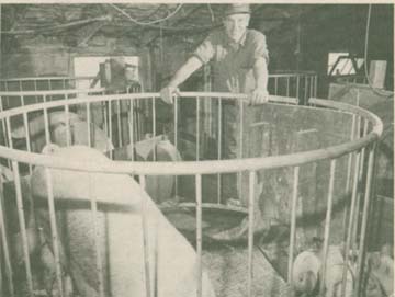 The farrowing section of Hilbing's hog barn is 30 ft. long and 30 ft. wide with a 3-ft. wide alley down the middle, leaving 13 1/2 ft. on each side of the alley. On one side of the alley are six conventional rectangular farrowing crates, each 5 ft. wide and 13 ft. long, over a solid floor with gutter. On the other side of the alley, in the same space, Hilbing installed eight round farrowing crates.