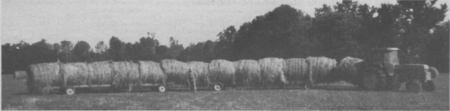 "My three home-built bale trailers let one man easily move 100 big round bales 10 miles from field to the farm in a day without ever leaving the tractor seat. It's the most efficient and economical bale handling system I've seen," says Dennis Albright, Eudora, Ark., who used 33-ft. logs to make his three convenient bale transporters.