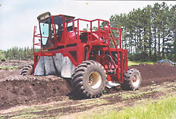 His prototype turner was built from a 715 IH combine. After taking on another job composting wood waste for a paper plant 50 miles away, he knew he needed something bigger.