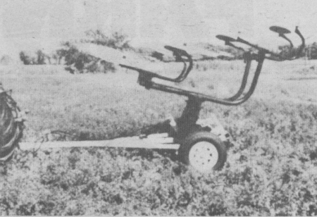 Designed to accommodate all makes of fingerwheel rakes, it converts 8, 10 or 12-wheel V-rakes to pull type, eliminating the hassle of physically having to pivot the rake from raking to transport position. One double-acting cylinder folds the rig from raking to transport position and vice versa.