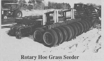Allen Johnson, Cedar, Minn., uses a home-built rotary hoe grass seeder with a double row of car tires on back to seed bluegrass at about 1/4 the normal recommended rate with good results.