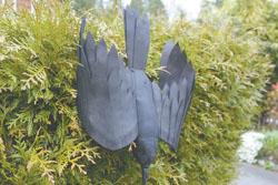 Trimble turned to her sewing and crafting skills when she learned that pest control companies didn’t really want to deal with crows. With polyester stuffing, wire in the wings, and all-weather nylon fabric she came up with a realistic design that could be shaped and hung to appear to be a dead crow.